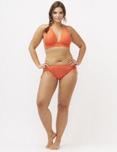 This tie-halter soft cup bikini top is available in sizes 20 to 28. It has an on trend triple back strap with clasp.