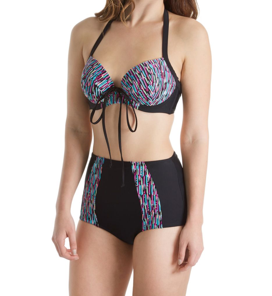 The tankini top has a self-tie halter strap with wire-free, molded cups on a power mesh lining bust support. The asymmetrical sarong front and back swim skirt has a built-in lined swim brief.
